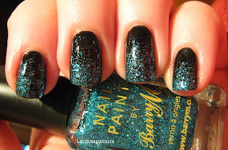 For this look I started off with a coat of OPI Nail Envy followed by two coats of Rimmel Black Cab.  Then using small pieces of a makeup sponge, I applied Barry M Aqua Glitter.